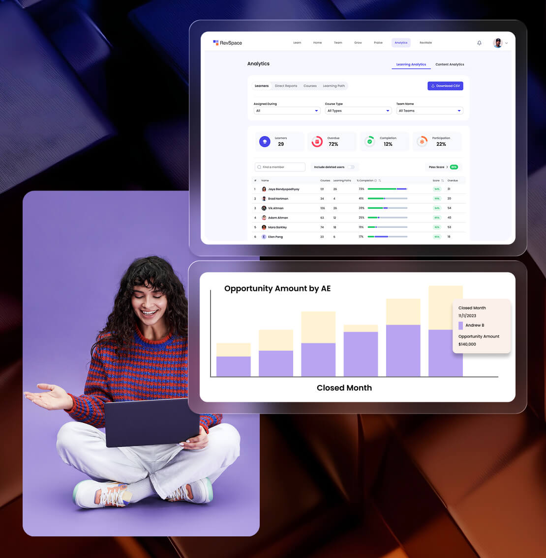 Measure learner’s earning progress with our CRM connector. Time to quota, impact of new enablement program or a sales methodology change management – visualize business impact in RevSpace sales performance dashboard.